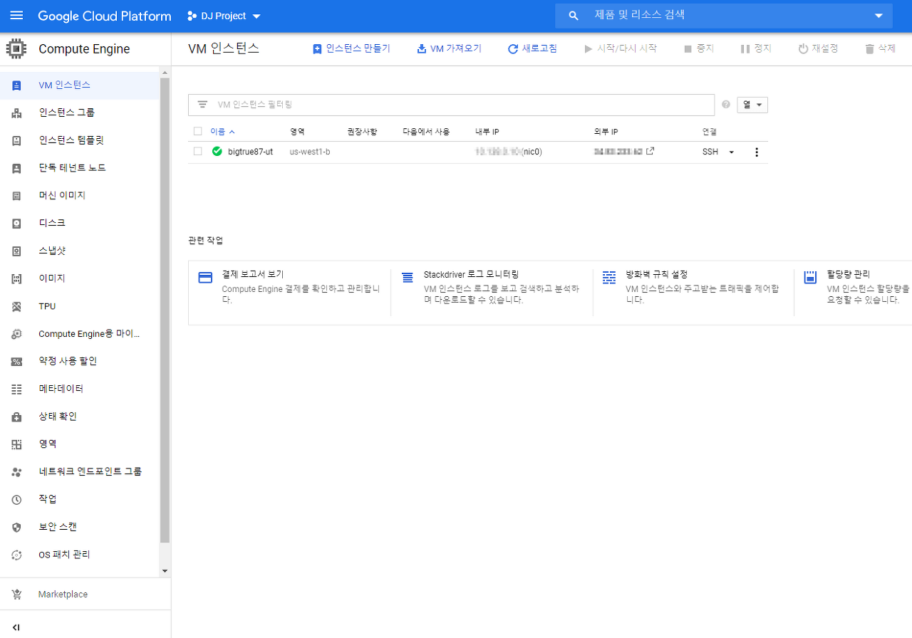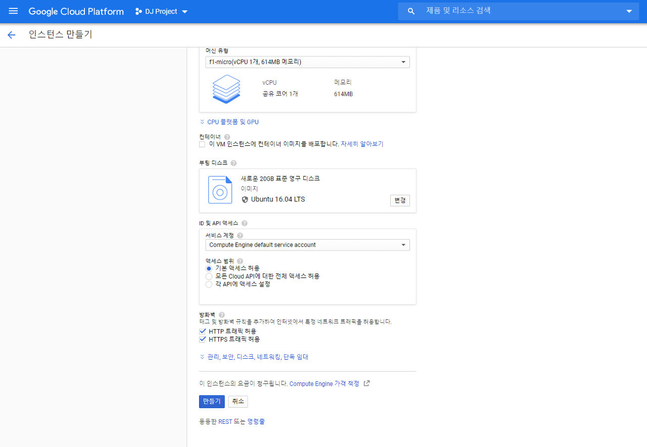 - 머신유형 : f1-micro(vCPU 1개, 614MB 메모리)